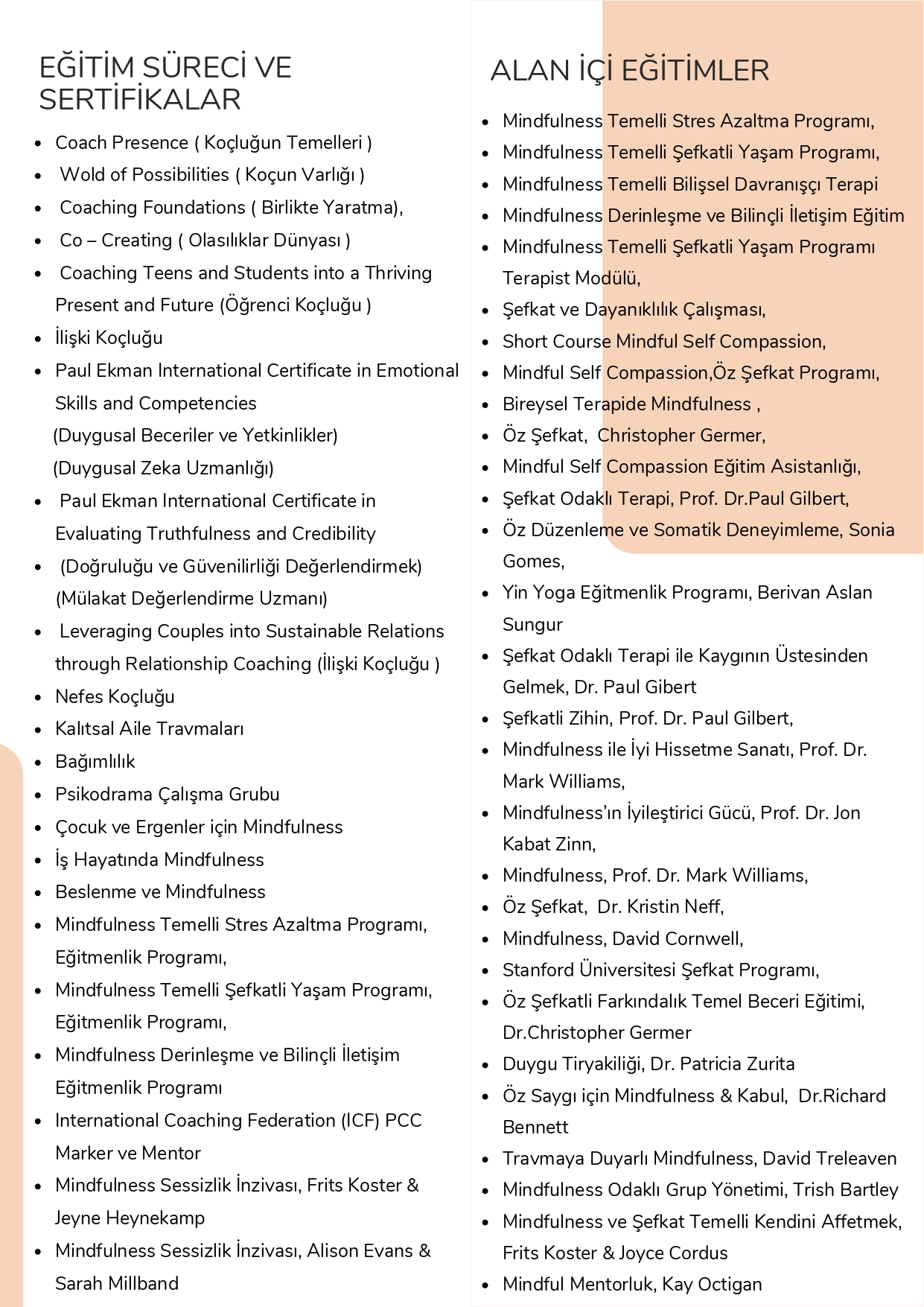 Bugün kurucusu olduğum Mindfulness ve Şefkat Akademisi çatısı altında, travmaya duyarlı, güvenilir, uluslararası akreditasyonlara sahip eğitimler sunuyor; her katılımcıyla birebir temas edebileceğim küçük gruplarla çalışıyorum. Benim için eğitmenlikten çok “rehberlik” daha doğru bir tanım. Çünkü her insanın içinde açığa çıkmayı bekleyen bir potansiyel olduğuna inanıyorum.